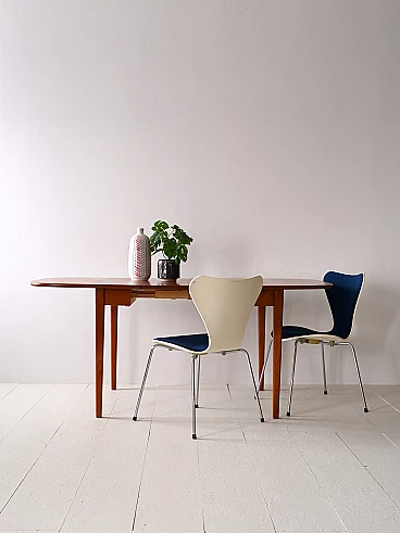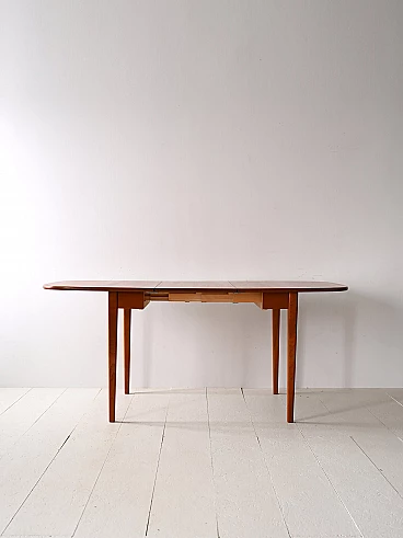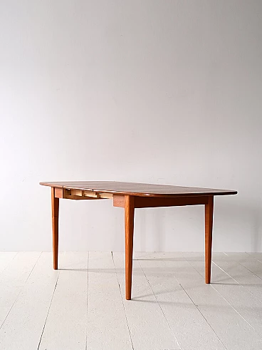 Scandinavian extendable teak table with side flaps, 1960s-70s. This piece of furniture encapsulates the essence of Scandinavian design that combines aesthetics and functionality. Because it can be opened when needed, it is also perfect for smaller rooms. It features a top with rounded corners and long tapered legs. The structure with the warm color of teak wood makes it an elegant table that suits different types of environments. It may show some signs of time. Please pay attention to the photographs.