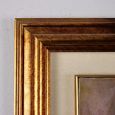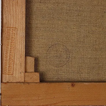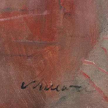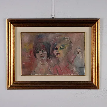 Oil painting on canvas by Mino Maccari (1898-1989) depicting female figures, 20th century. Signed at lower left. Maccari's artistic production is mainly aimed at social and political satire, expressed mainly through drawing; moreover, he never positioned himself as a judge of Italian customs but rather as an amusing, and amused, chronicler of society's vices and weaknesses. In his pictorial production, while not deviating excessively from the themes of his drawings, he accentuates the fantastic aspect more: with quick, decisive brushstrokes and bright, often violent colors, he characterizes almost unreal or rather caricatured figures. The work is presented in a frame. Size without frame: 40 x 60 cm.