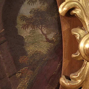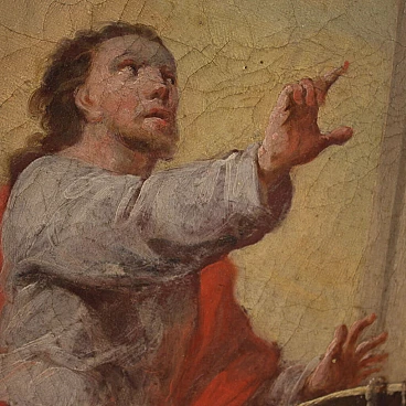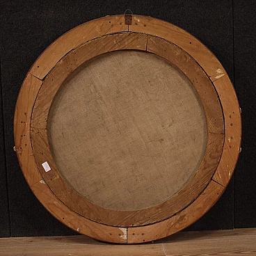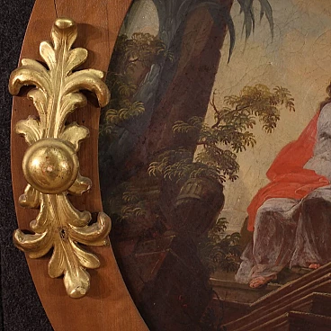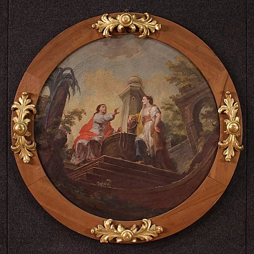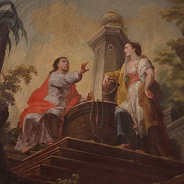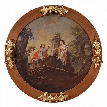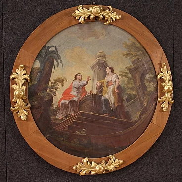 Italian painting from the first half of the 19th century. Work with a religious subject, oil on canvas, first canvas, of excellent pictorial quality and particular workmanship. The perception of space is distorted because the author created the scene using a convex mirror. The painting depicts the story of Jesus and the Samaritan woman at the well. Christ is traveling and approaching a well he asks a woman of Samaritan origins for a drink. For the Jews, the Samaritans were impure so they didn't speak to him, but Jesus doesn't worry about this and the woman reacts with amazement. Work that is part of a pendant (see photo and ask for the price of the pair, if available). Wooden frame with beautifully decorated carved and gilded elements. Two golden elements (right and bottom) with small defects (see photo). Work that shows some small signs of aging (see photo), in a beautiful patina, overall in a good state of conservation. Light painting D 69 cm.