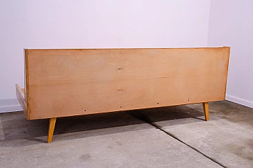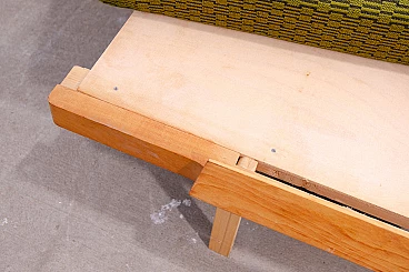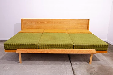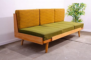 Mid-century sofa bed, made in the former Czechoslovakia in the 1970s. The sofa has a beechwood frame, it is in good condition and it shows signs of age and use, as can be seen in the photos. Length: 199 cm, height: 86 cm, depth: 87 cm, seat height: 45 cm.