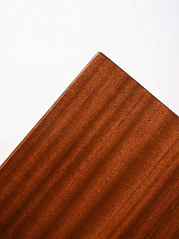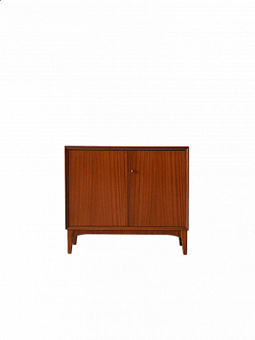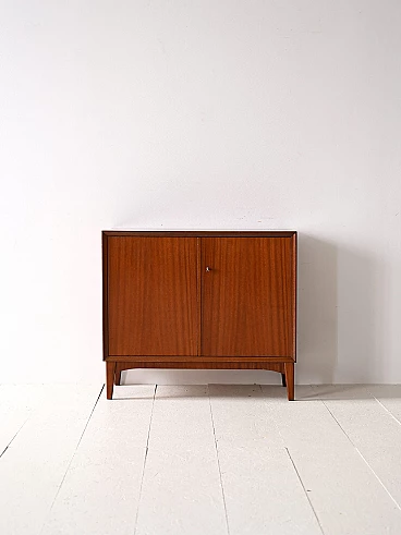 Scandinavian mahogany sideboard with hinged doors, 1960s. This piece of furniture with simple, modern lines consists of a structure with a storage compartment closed by two lockable hinged doors. Inside are two shelves that divide the space. Thanks to its small size and the possibility of being locked, it is suitable for recreating a corner dedicated to the storage of documents and personal items without sacrificing style. Mahogany wood with a warm, bold color gives it an elegant look with a retro flavor. A conservative restoration has been done. It may show some signs of time. Please pay attention to the photographs.