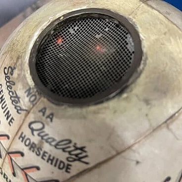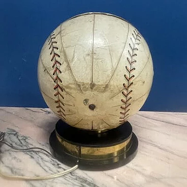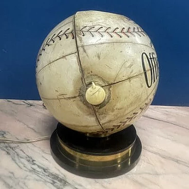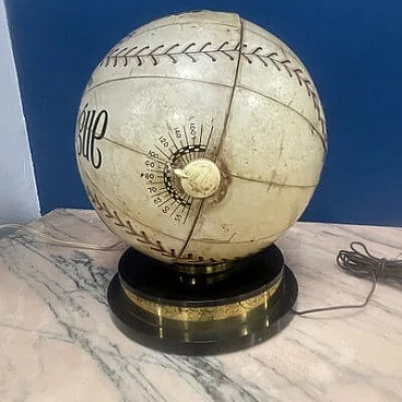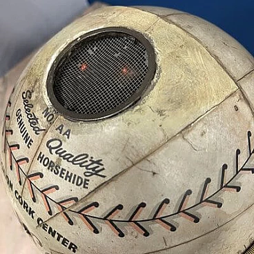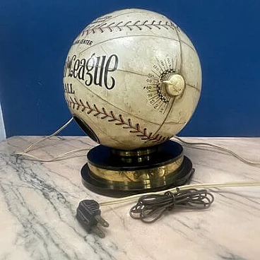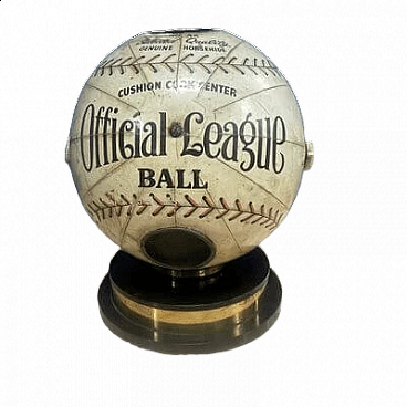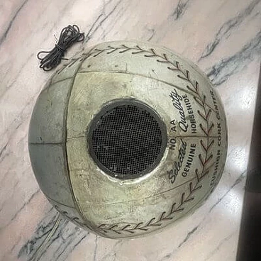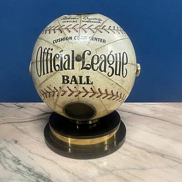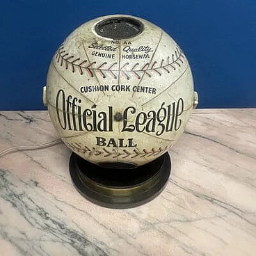 This fantastic item recalls the days when radio was king and radio broadcasts were the most popular way for fans to follow Major League Baseball across the country. The radio, in the shape of an 8-inch diameter baseball, is made of heavy cardboard wrapped in a paper application designed to replicate a baseball with black and red stitching and labels that read: "Official League Ball" and "Cushion Cork Center". A metal-plated 'Trophy' radio logo medallion is attached to one of three 2" diameter mesh-vented speakers above the 'N0. AA Selected Quality Genuine Horsehide" with an on/off switch and volume control knob on the right side of the sphere and a radio station change knob on the left side. The sphere is mounted on a circular acrylic base from which a power cable and antenna protrude. The radio is in good visual condition and only works well in AM. This is the perfect accessory for any game room or 'man cave'.