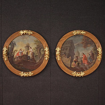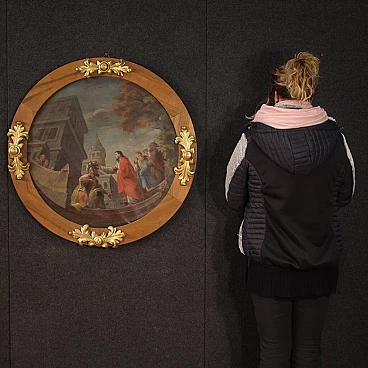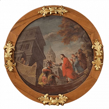 Italian painting from the first half of the 19th century. Work depicting a story from the Gospel of Luke, the healing of the centurion's servant. A commander had the fate of one of his slaves at heart and asked Jesus to heal him. The Gospel presents the Roman soldier as a good and humble man who does not take advantage of his position to obtain a favour. Oil painting on canvas, on first canvas, of great pictorial quality and particular workmanship. In fact, the perception of space is distorted because the author has realised the scene using a convex mirror. Painting as part of a pair (see photo and ask for the price of the pendant if still available). Wooden frame with carved and gilded elements of beautiful decoration, with some signs of time. Work in overall good state of preservation. Painted light D 69 cm.