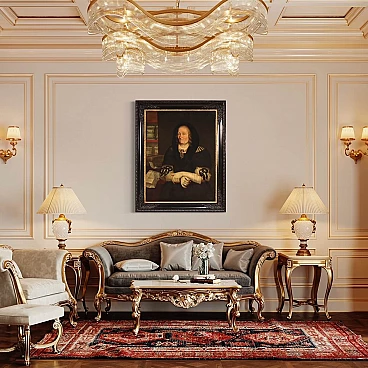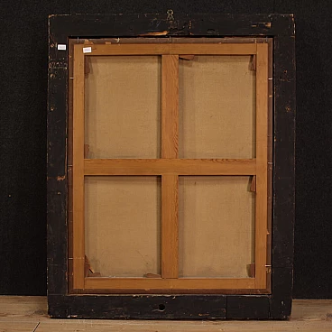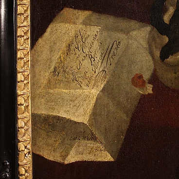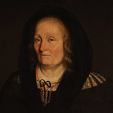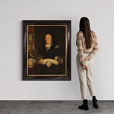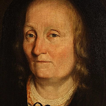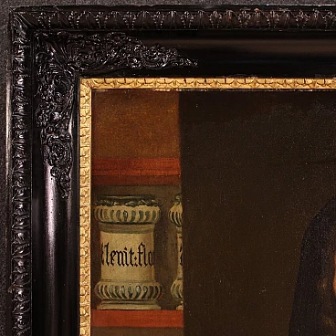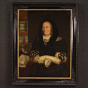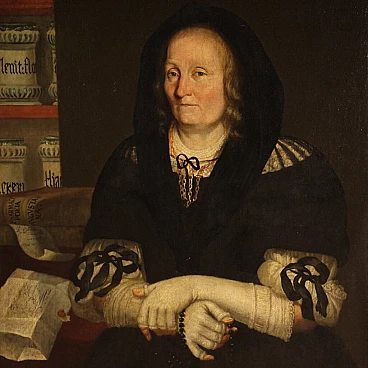 Antique Italian painting from the second half of the 17th century. Oil on canvas portraying an old woman, 'The pharmacist's widow of Trento', of good painterly hand. Particular subject of great size and strong visual impact adorned with a 19th century wood and plaster frame, carved, ebonised and gilded. Work rich in decorative elements, very pleasing the apothecary vases to the left of the figure. Very well painted is the widow in a dark dress with finely finished lace. An inscription (bottom left) provides information about the place and the figure portrayed (see photo). Painting that has undergone conservation restoration, re-staining, replacement of the frame and repainting in places (see photo). Painting in overall good state of preservation. Light painting H 107 x W 82 cm.