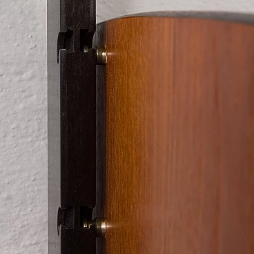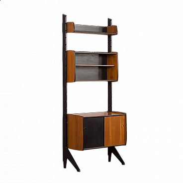 Ergo free-standing single-bay teak and black varnish bookcase, made in the 1960s in Norway. It has been upcycled with great attention to detail and very refined carpentry solutions. Some parts were redone by our carpenter and painted black; most are original teak parts by John Texmon. Ergonomic mid-century shapes and delicate lines, especially a black paint finish, enhance the teak grain and mid-century look of this piece. The manufacturer's label is preserved on the back. This bookcase is made up of modular parts and can be organized as needed. It is equipped with a cabinet, a display case and a shelf, which provides additional storage space and creates a functional space. It is possible to add a clear glass door to the cabinet but in our opinion it looks better without it. The cabinet is 47 cm high, 78.5 cm wide and 40 cm deep. The display case with inside wooden shelf is 43 cm high, 78.5 cm wide and 22 cm deep. The shelf with back and sides is 14 cm high, 78.5 cm wide and 21 cm deep. The two wooden uprights are 210 cm long. The bookcase has been carefully checked: all components fit together and work properly. Small natural signs of use are left which do not ruin the aesthetics of the furniture and only confirm its originality.