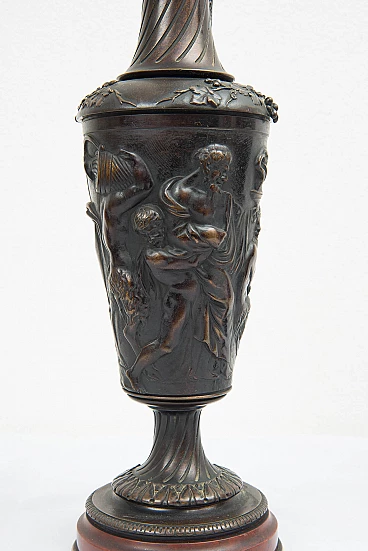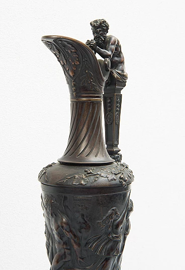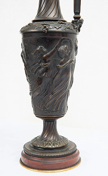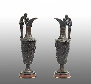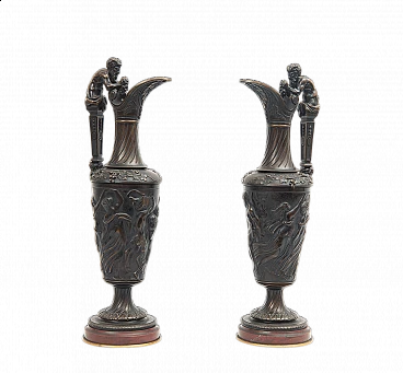 Pair of Napoleon III patinated bronze water jugs resting on a Rouge Griotte marble base and made in France in the 19th century. The central stem features dense chiseling depicting mythological scenes. The handle ends with a figure of a satyr holding a bunch of grapes.