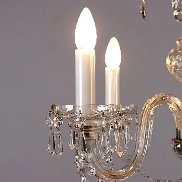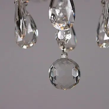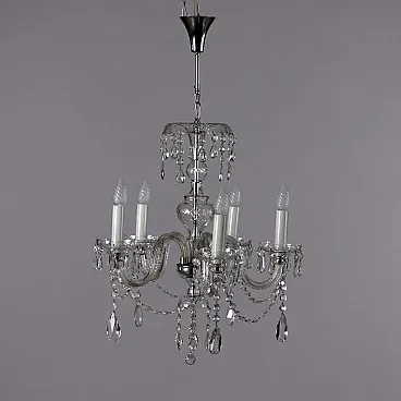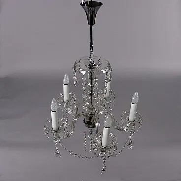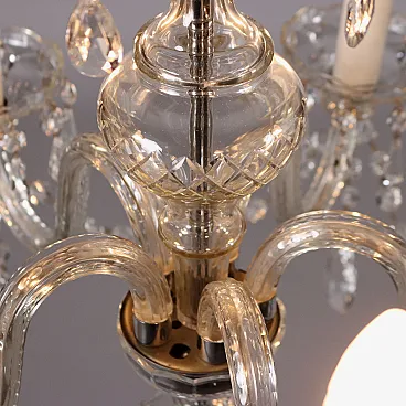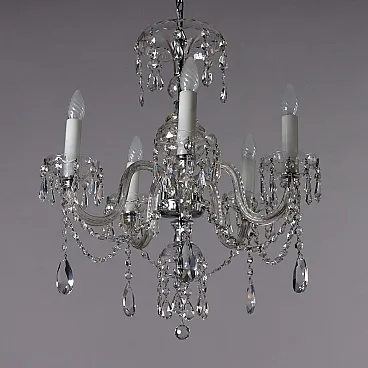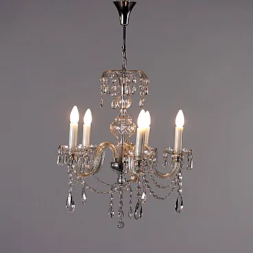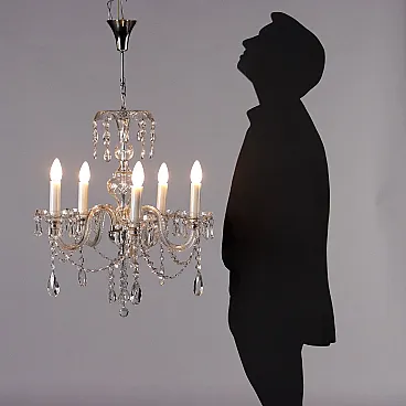 Five-light chandelier with crystal and cut glass structure enriched with crystal chains and hanging elements, 20th century.