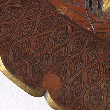 Bronze plate decorated with a scene of lohans 'enlightened disciples of Buddha' intent on various prayer tasks in a river landscape of lotuses and birds. The figures of monks rendered in bas-relief in gold and silver agemine, the landscape artfully chiselled. The rim of the plate with flowery lozenges partly worked in acid on lost wax. Japan Meiji era 1868-1912.