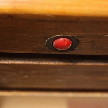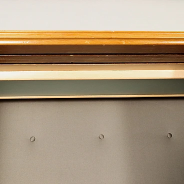 Coat stand with sliding doors and interior lighting. Mahogany veneered wood with mirrored glass, fabric lining and brass band.