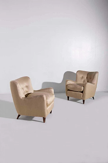 Enter a world where the essence of 1940s Italian design takes centre stage, embodied by a rare pair of armchairs designed by the legendary Giò Ponti for a naval project. These exceptional pieces were part of the furnishings on board the illustrious liner Conte Grande when it set sail in 1949. Made under the watchful eye of Italian craftsmanship by Cassina, these chairs are a true testimony to an era of unparalleled elegance. Accompanied by an archival certificate. The first thing that strikes one when looking at these chairs are their fluid, graceful lines. Designed with the utmost attention to the comfort of their occupants, they invite you to sink into their embrace, promising a moment of respite and relaxation. The sinuous curves of the armrests and the gently rounded contours of the backrest exude an inviting warmth, as if tailor-made to cradle you in comfort. The upholstery of these extraordinary armchairs is a testament to luxury and sophistication. Wrapped in a soft semi-silk and cotton fabric in a soft beige shade, they evoke a sense of timeless sophistication. The backrests are embellished with decorative buttons that add a touch of opulence and character to the design. But it is in the details that these chairs really shine. At the back are two conical rear legs that lend a sense of balance and stability. At the front, the semi-curved legs exude an air of grace and elegance, perfectly mirroring the curves of the chairs themselves. It is a harmonious blend of form and function, a testament to Giò Ponti's genius as a designer.