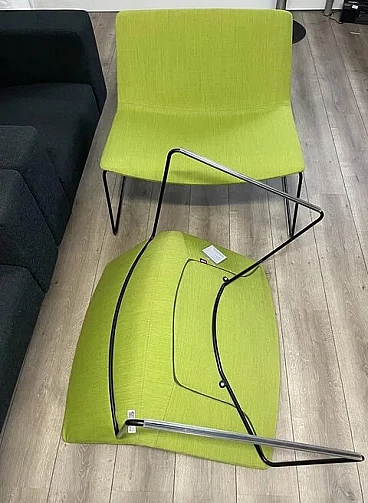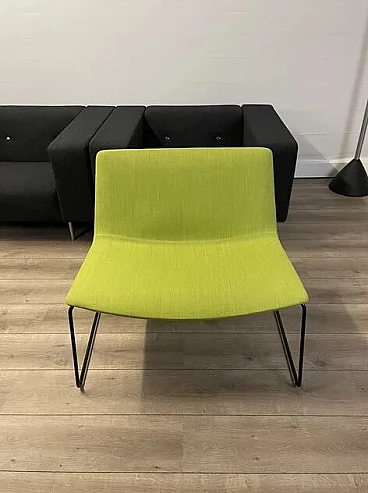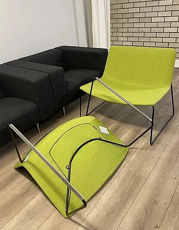 Beautiful pair of Catifa 80 armchairs, produced by Arper, from the steel sled series in black finish, in soft semi-smooth material fabric in apple green colour, at the top of the range of fabrics in the catalogue. Three-handed design by Studio LAM by Lievore Altherr Molina, series designed in 2006. In excellent condition. Minimal signs of use, exhibition set. Very comfortable set. Dimensions: W 85xD 64xH 71.5 cm, seat height 39.5 cm.