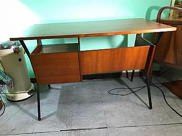 Scrivania o scrittoio da centro di manifattura italiana anni '50, in teak con struttura, maniglie e piedini in metallo laccato nero e completa di due cassetti e due scomparti laterali di appoggio. #madeinitaly
