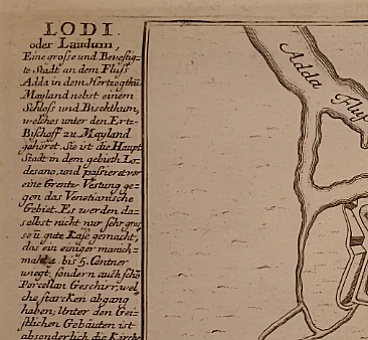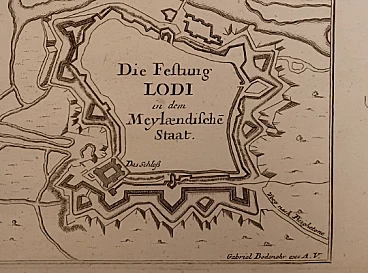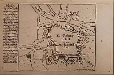 Etching "Lodi" by Gabriel Bodenehr (Augsburg 1664 – 1765). Gabriel Bodenehr the Elder was a German engraver and publisher. Son of Johan, a burin engraver, he engraved various historical and topographical subjects including a close-up view of Passau (1710) and a series of 127 illustrations for the Bible. He is known today for his Atlas Curieux (1704). His son, Gabriele the Younger (1705-1779), followed his father in his profession and was a well-known engraver in the black manner specializing in portraits. This print is taken from the atlas on the Force d'Europe fortifications of 1725. The defensive structure of the city of Lodi is represented. The artist focuses on the description of the city walls and the fortification system that was implemented thanks to the Adda. He deliberately neglects the description of the interior of the city, where the title is engraved. On the left there is historical-statistical information on the city in German. In the lower right corner "G. Bodenehr exc. Aug. Vind.". Excellent impression. Excellent state of conservation. Wide margins beyond the copper mark.