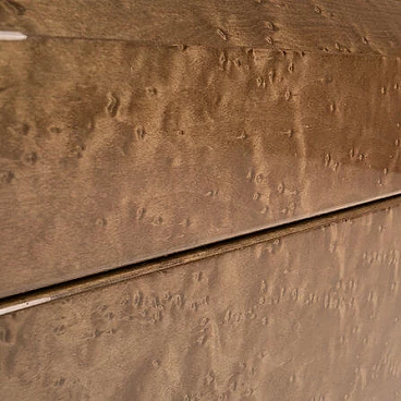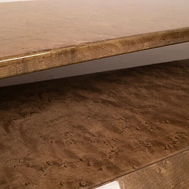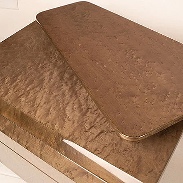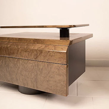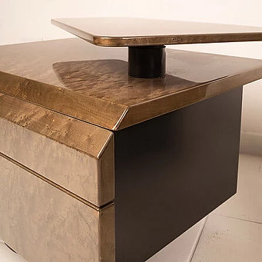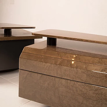 Extraordinary and rare pair of Lenox bedside tables by Giovanni Offredi for Saporiti, early 1980s. They are entirely covered with precious "occhio di pernice" maple-root and are in perfect condition, like new despite being produced in the early 1980s. They have two drawers each and a particular revolving shelf that provides service directly while lying in bed, with the typical circular base of the series which makes them of a very current and timeless design. The chest of drawers is also available from the same series (for further information contact the seller).