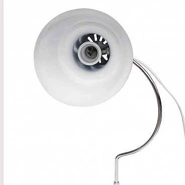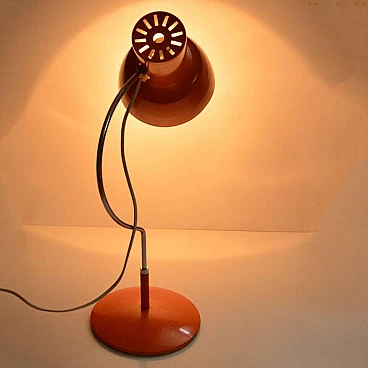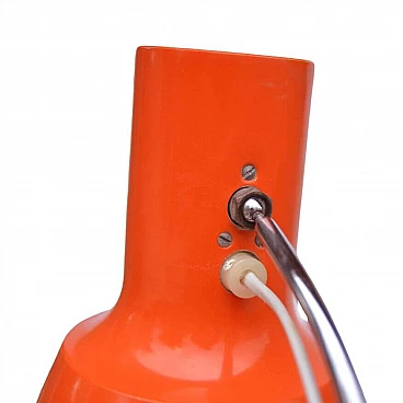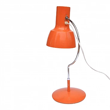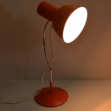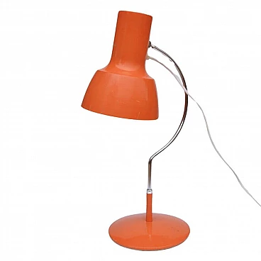 This new-look table lamp was designed by Josef Hurka for the Napako factory in Prague in the 1960s. The lamp is made of lacquered and chrome-plated metal. It has a conical shade mounted on a joint; the angle of the shade can be changed as desired. The lamp has bulbs with an e27 socket and a switch in the shade; the lamp is sold without a bulb. The electrical system is functional. The lamp is in good original condition, paint damage to the shade, no damage to the chrome, defects visible in the photos. Another lamp like this in green is available. Dimensions: height 50 cm | width 18 cm | depth 27 cm | diameter lampshade 16 cm. Dimensions in inches: height 19, 7 in | width 7, 1 in | depth 10, 6 in | shade diameter 6, 3 in.