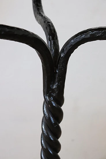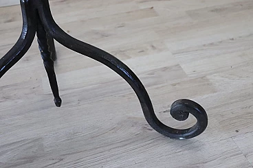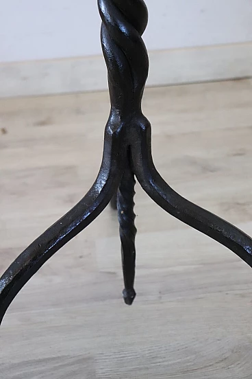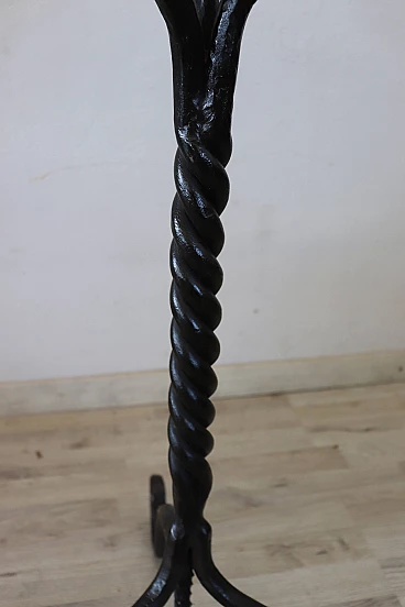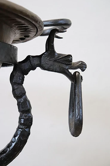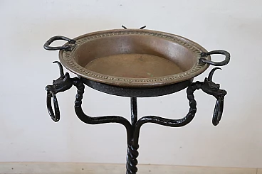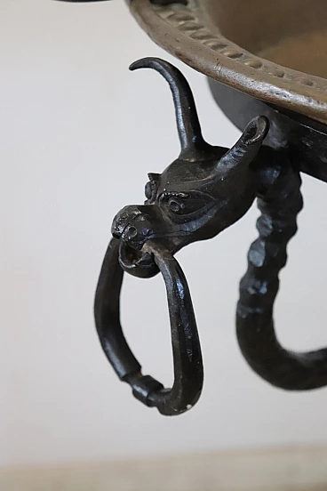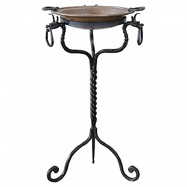 Renaissance-era brazier from the 16ht century, truly rare. It features a copper tray and a hand-forged iron pedestal of excellent workmanship. The pedestal has three feet and a decoration with grotesque figures. The copper tray is not from the 16th century.