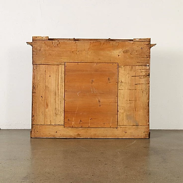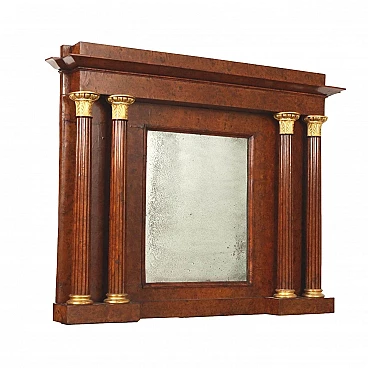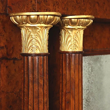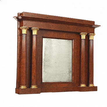 Charles X mantelpiece entirely panelled in elm burl, Lombardy third decade of the 19th century. Attributable to the production of Paolo Moschini, a skilled marquetry and cabinetmaker active between Soncino, his birthplace, and Milan in the first half of the 19th century. Front with architrave and projecting plinths, joined by double columns finely fluted and embellished with gilded wooden capitals, the upper ones carved with frets and acanthus leaves. Base and architrave corners threaded in amaranth, column profiles threaded in ebony. Central mercury mirror set within frame.