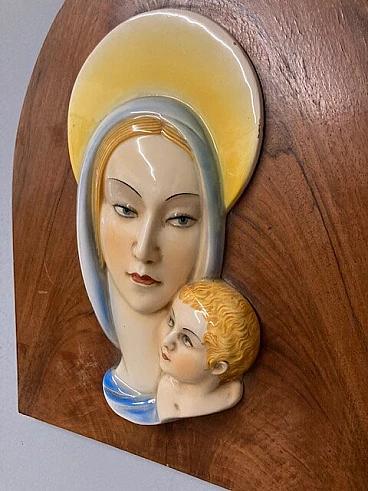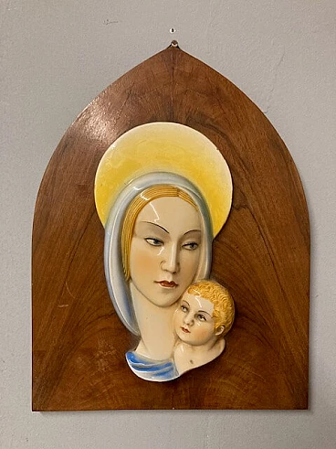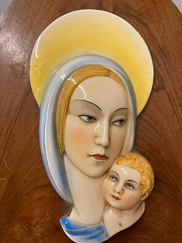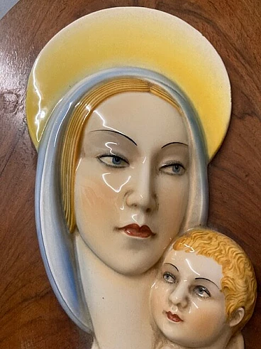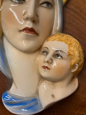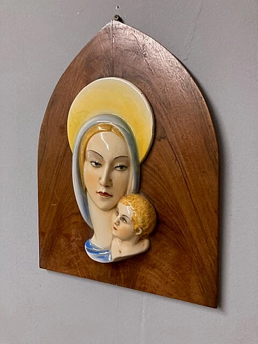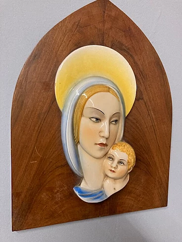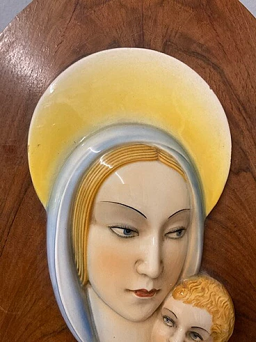 Polychrome majolica plaque depicting Madonna and Child, 1940s