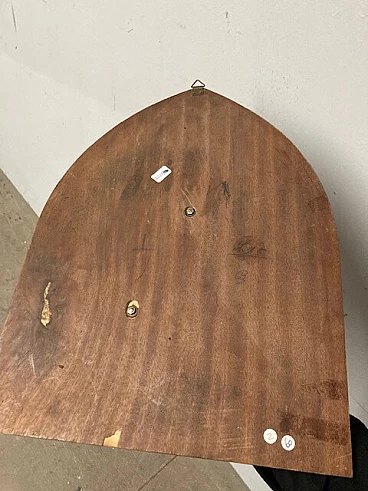 Antique polychrome majolica plaque depicting the Madonna and Child, 1940s. Hand-painted in Art Deco style. On walnut wood base. On the back original price: 75 Lire. In very good condition. Measures 41 cm x 30 cm.