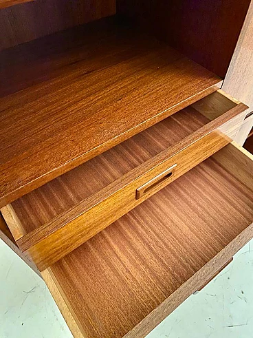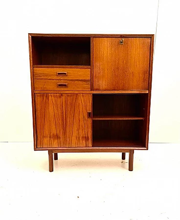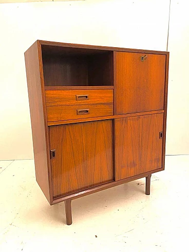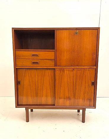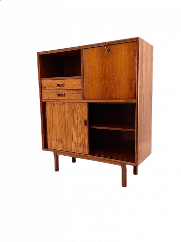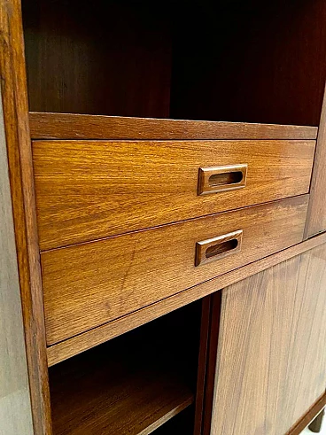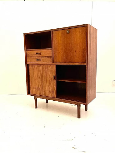 Scandinavian-style sideboard from the 1960s. Rectangular shape with solid wooden feet and high-quality teak veneer frame. Sliding doors at the bottom, two wooden drawers and one hinged drawer. Completely restored: the wood has been treated against wear, the surface has been cleaned and polished, the opening system of the drawers and doors has been restored. In excellent condition, with few signs of time, slight differences in the colour of the veneer due to exposure to the sun over decades, micro-scratches and small marks on the white Formica interior panel, not visible from the outside.