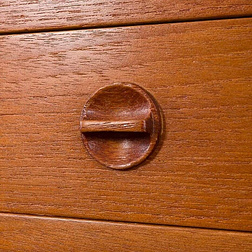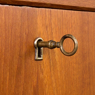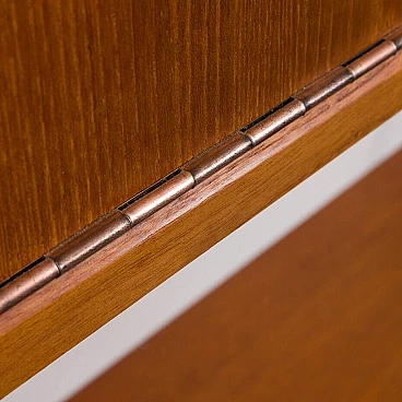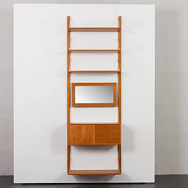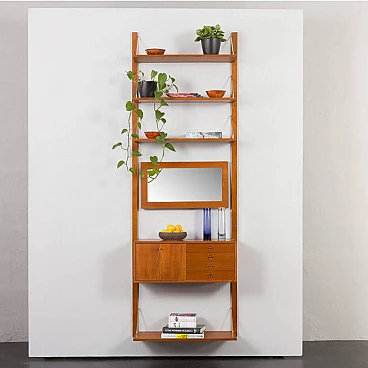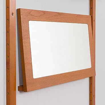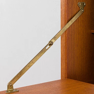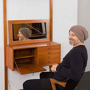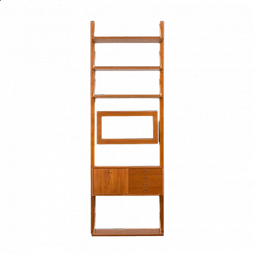Mid-century teak bookcase with folding door cabinet and portable mirror, designed in the style of Poul Cadovius. It can be a functional vanity, suitable for any bedroom, entrance hall or small living room. It is also useful as an entrance cabinet for storing hats, keys and small decorations. The cabinet has four drawers and a lockable door (key included). The shelves have two different depths, the bottom one and the top one for larger items. The configuration is up to you; all parts can be moved down, up and swapped. In addition, the wall cabinet is equipped with a useful portable mirror placed on the wooden board that can be wall-mounted or placed on top of the cabinet, as it has an additional support. The cabinet consists of: one 20 cm deep shelf; two 24 cm deep shelves; two 30 cm deep shelves; a cabinet with lockable flap doors and four drawers; H:30/W:75/D: 34 cm (key is included) H:30/W:75/D: 34 cm; drawer height: 6 cm; mirror H:35/W: 66 cm; two 170 cm long and two 60 cm long solid wood rails, combined in two sections with a total height of 230 cm and brass hardware. We recycled most of the parts of this cabinet, which came from the 1960s. The shelves were refinished and the brass hardware was polished. We made sure that the doors and drawers work smoothly and that all components fit together. The mirror was refinished. All the wood was treated with a few coats of Danish oil. We are trying to restore it to its best appearance, always considering that it is 60 years old. The set is in fantastic vintage condition with slight traces of use and polished brass fittings.