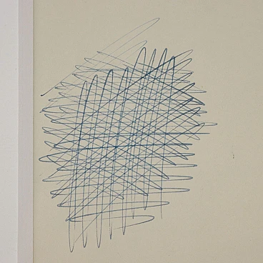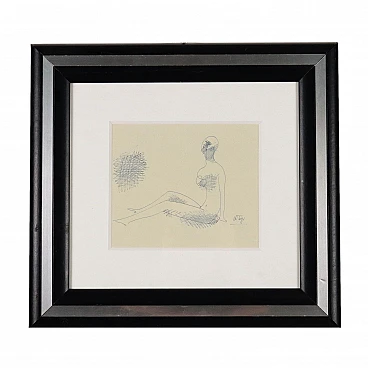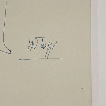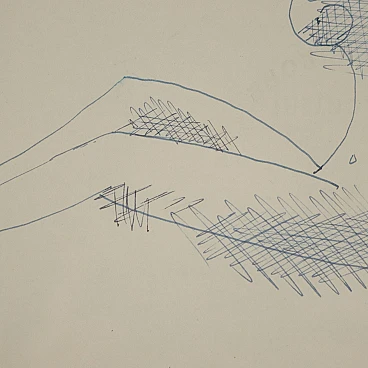 Ballpoint on paper, signed lower right. Accompanied by authentication on photo from the Mario Tozzi Archive. In the master Tozzi's extensive production there are many drawings, such as this one presented here, executed with different techniques (ink, pastel, pencil, sanguine), dedicated to the human figure. In his dry and stylised style, Mario Tozzi sketches stylised figurines, refined in their silent and discreet geometry, favoured by the absence of colour, which makes the shapes stand out on the white paper. Also in his pictorial production, Mario Tozzi's favourite subjects are, classically, figures and still lifes, but both figures and still lifes are a set of solid geometric elements, the sphere, the cylinder, the cone, etc. The bodies are elementary, essential in their lines and details, powerful, statuesque, composed of barely modelled solids, while the still lifes are a celebration of Euclidean geometry such as the jugs, bowls and flasks that are paradigms of volumetry and geometric rigour. Mario Tozzi's compositions are influenced by Cubism for certain cuts, Metaphysics for certain architectural insertions and Abstractionism for the inclusion of geometric figures. The work is presented in a frame.