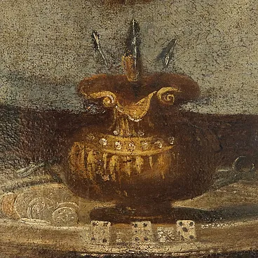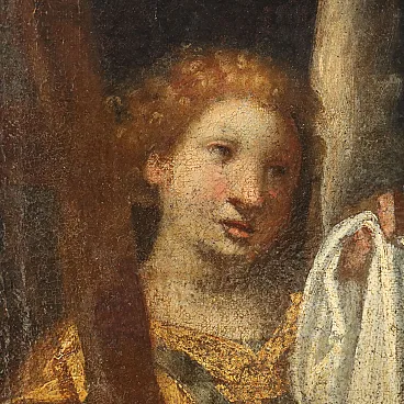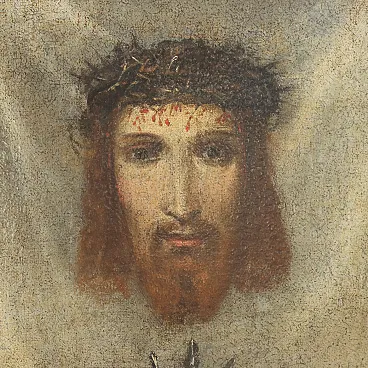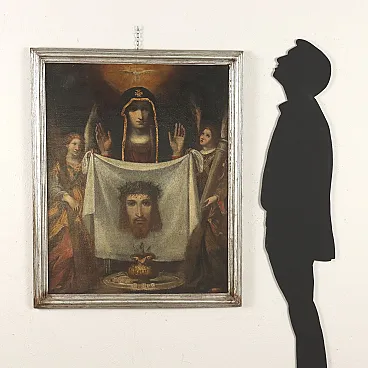 Oil on canvas. 17th-century Tuscan school. According to Christian tradition, Saint Veronica was the 'pious woman' who, seeing the passion of Jesus carrying the cross and his face smeared with sweat and blood, wiped it with a linen cloth, on which the imprint of Jesus' face would remain. This cloth, also known as the Holy Shroud, has thus become the iconographic sign of the saint: in this painting, too, Veronica appears in the centre, while two angels on the sides hold the linen on which Christ's face is imprinted, crowned with thorns; below it, a chalice symbolically collects the divine blood, while above the saint's theta the Holy Spirit hovers. Restored and re-framed, the painting is presented in a stylish frame.