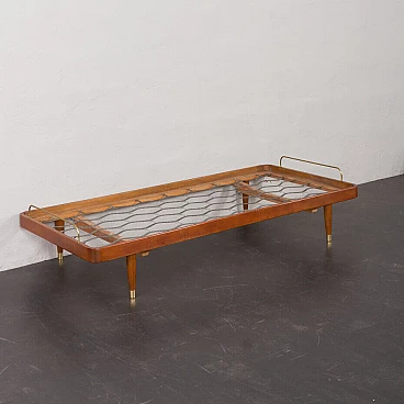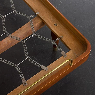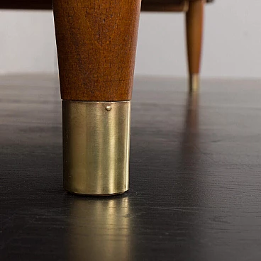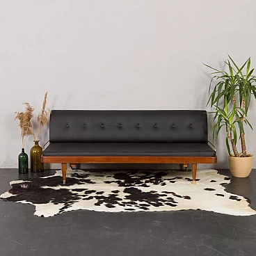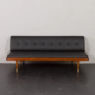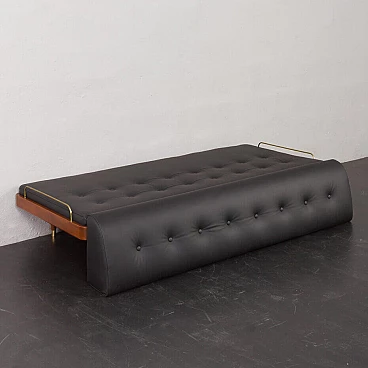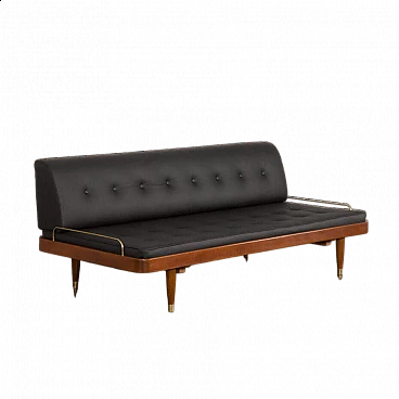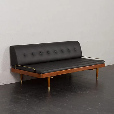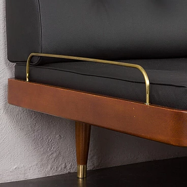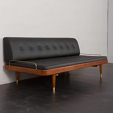 Mid-century Danish teak daybed, probably produced by Horsens Møbelfabrik in the 1960s. It expresses the essence of mid-century design: correct proportions and functionality. Its advantage is the removable backrest, which offers the opportunity to adapt the design to the interior and a hidden compartment for blankets, sheets and pillows in the backrest. The frame is solid wood, stained teak (often found in Horsens daybeds), while the upholstery is new black leather. It is closely reminiscent of designs by Hans Wegner or Orla Molgaard from the same period. The daybed is in fantastic condition after a complete restoration. It features excellent craftsmanship in appropriately selected and coordinated teak wood throughout, with brass armrests and feet. The mattress rests on horizontal springs that run through the bed frame. The wood has been treated with layers of Danish oil and all springs have been checked. Additional dimensions: backrest H: 38 cm/W: 190 cm/D:23 cm, mattress H: 37 cm, height from floor: H: 23 cm.