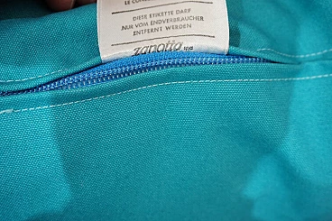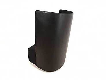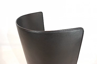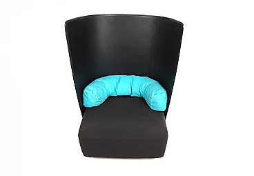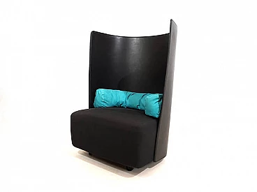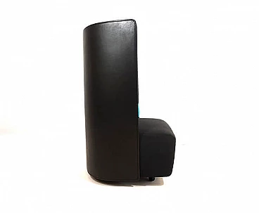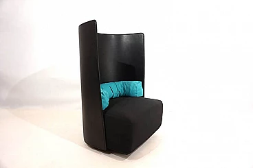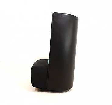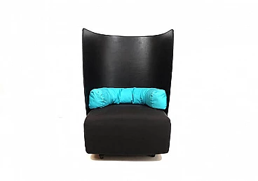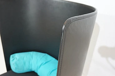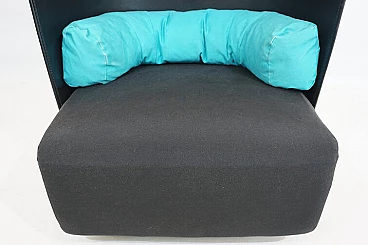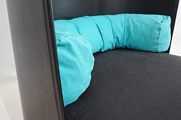 The imposing design of Campo, with its high back, is still striking today. This model with a black backrest and black fabric seat is in excellent condition. The leather of the backrest shows hardly any signs of wear, while the seat is in excellent condition and offers good seating comfort. The turquoise cloth back cushion roller shows slight signs of wear. The chair is equipped with two front wheels that give it good mobility. Campo's broad design gives it the aura of a modern throne chair. The Italian design team of de Pas, D'Urbino and Lomazzi designed this chair in 1984 for the Italian manufacturer Zanotta, known for its innovative seating.