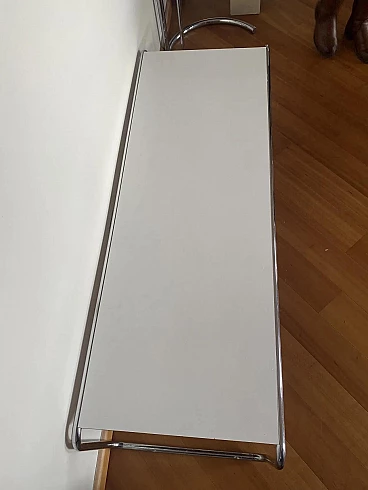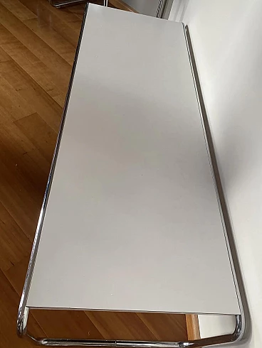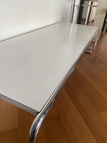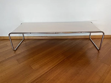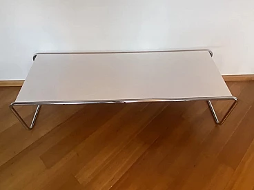 Laccio B10 coffee table by Marcel Breuer for Gavina, 1964. It is in excellent condition considering its age. It shows minimal signs of use, normal surface scratches. It was designed by Breuer during his years at the Bauhaus school. The structure is made of chromed Mannesmann bent steel, the practical top shelf is made of white formica; the latter is made of bilaminate with an MDF inner core. The thickness of the top is 20 mm. The Gavina company was absorbed by Knoll International at the end of 1969. This production was due to the foresight of the Romagna entrepreneur Dino Gavina, who in the early 1960s acquired the rights to the artifacts designed by the Hungarian architect. The Laccio model is currently produced in its two versions B9 and B10 by the American company.