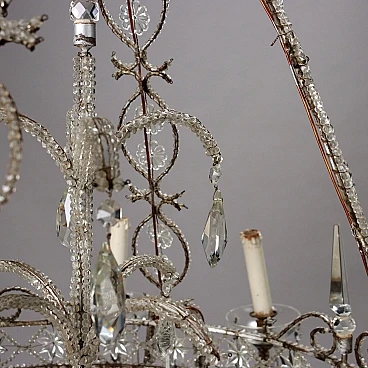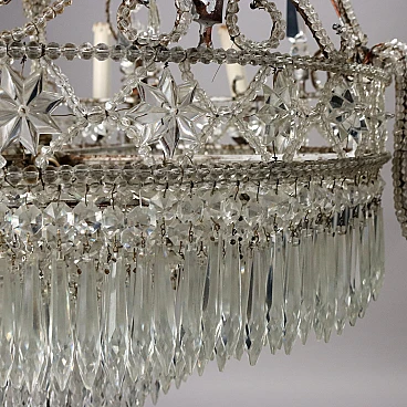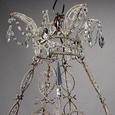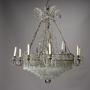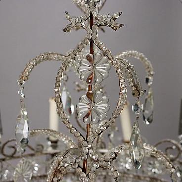 8-light chandelier with metal frame covered with glass beads, cascade pendants and crystal fountain stem. Italy 20th century.