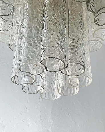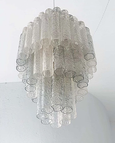 For sale is a large and dramatic Murano glass chandelier, made in Italy in the early 1960s. Although the frame and glass tubes are not signed, it is clearly made in the style of Toni Zuccheri and Venini, two of the main protagonists of the glassmaking scene of the period. The surface treatment of the tubular glass, as well as the mixed light and grey colour of the tubes, are clear evidence of this. The pendant lamp is preserved in good condition given its age, and although some of the glass tubes show small signs of age, such as small dents or tiny cracks, these defects in no way compromise the presence of the assembled piece and are easy to disguise with skilful placement of the tubes. The chandelier consists of sixty individually suspended tubes and is in perfect working condition. It may have been rewired at some point.