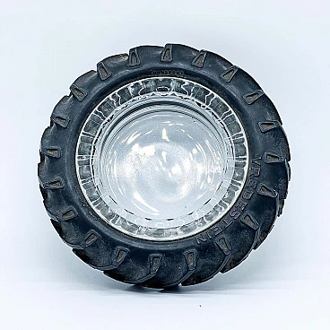 Vintage decorative clear glass tray surrounded by a black rubber offroad tyre with the embossed name 'Vredestein'. The piece was in fact a collector's gift from the Dutch company of the same name, a leading manufacturer of tyres of all kinds. This piece is an ideal gift for a car enthusiast and will fit perfectly in a man cave, but also on a bookcase, desk or sideboard. It will give an unexpected, playful and fresh touch to any interior. The piece shows signs of age, including some dust on the rubber that we did not clean to leave the piece in its original, patinated condition. However, a quick rinse will be enough to restore it to like-new condition. We are a design studio specialising in interior decoration, furniture design and the hunt for mid-century collectors' pieces.