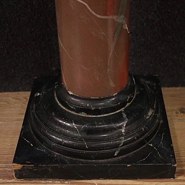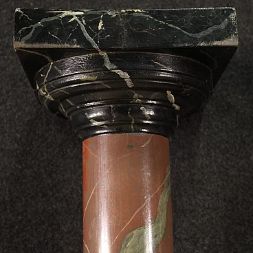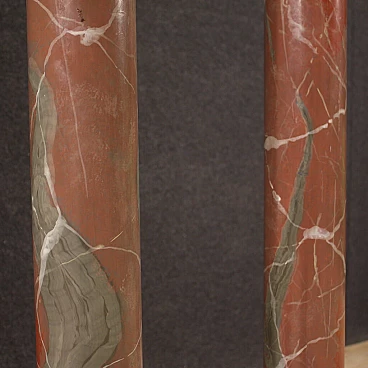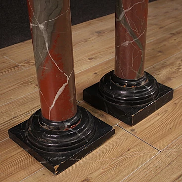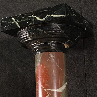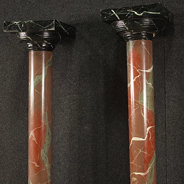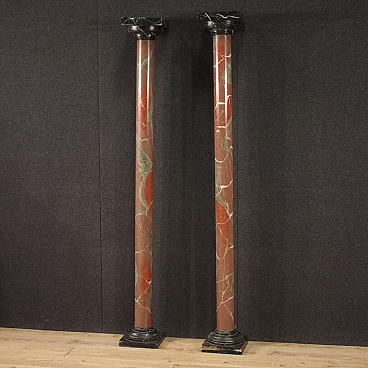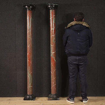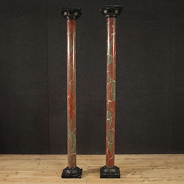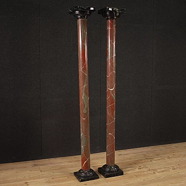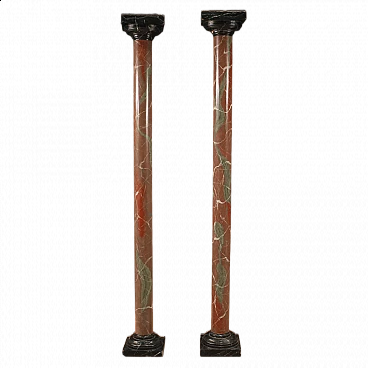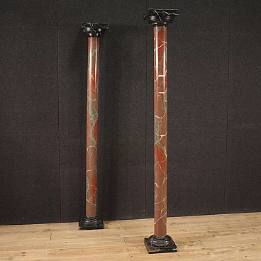 Pair of French decorative columns from the second half of the 20th century. Finely lacquered and painted imitation marble. Objects for antique dealers and interior decorators, consisting of wooden base and capital, central body (column) in plastic. Columns ideal to be placed in a living room, at the side of a beautiful piece of furniture or painted, fabulous decoration. Props, to be fixed to the wall for perfect stability (capital complete with metal hook). Furniture with some minor colour fading, in beautiful patina, structurally sound and in good condition.