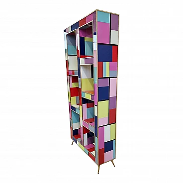 Double-sided bookcase in wood, brass and multicoloured Murano glass, 1990s