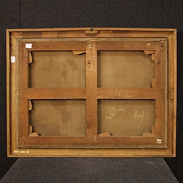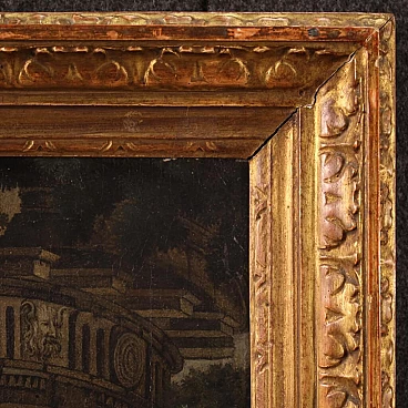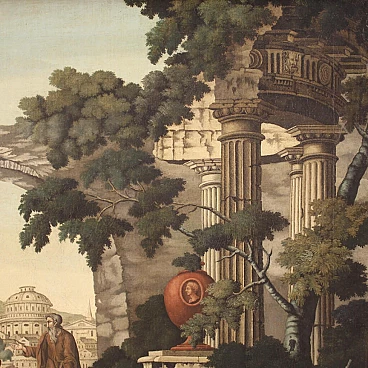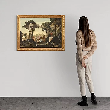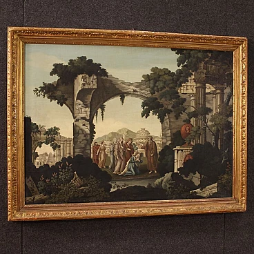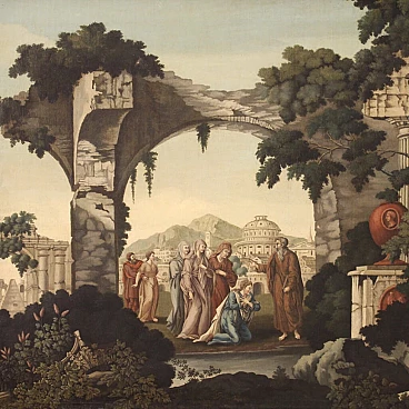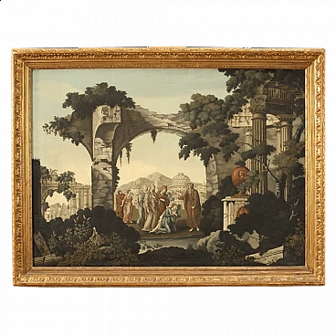 Old English painting dated 1762. Oil on canvas work initialed at lower left "J. B. J.," referable to John Baptist Jackson (1701 - 1780); lacking authentication. Depicting a religious subject, specifically the Baptism of Lydia by St. Paul in the city of Thyatira. Painting of excellent painterly hand, richly decorated on the front and in the background. Painting that has an inscription by the painter in the lower right-hand corner - "Ch. XVI, Ver. 14,15,16,17" (see photo) - referring to the biblical scene he depicted. Non-coeval, 20th-century wooden frame, nicely carved and gilded. Painting characterized by fabulous perspective, finely embellished with classical ruins, for antiquarians, interior decorators and collectors of sacred art. Painting that underwent conservation restoration, frame replacement and has been restretched during the 20th century. In good condition. Size without frame: 66 x 92 cm.