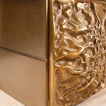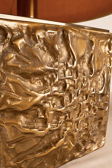Pair of cast brass table lamps with a striking brutalist design, signed by the renowned designer Luciano Frigerio for the illustrious Frigerio brand of Desio in the 1970s. These lamps, in impeccable condition, still retain their original linen caps with an elegant brass border. The brass has a patina of age that has not been polished, for lovers of objects with a story to tell. It should be noted that one of the hats shows some signs of aging which does not compromise its use.
