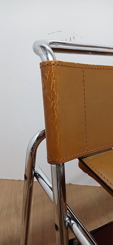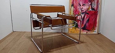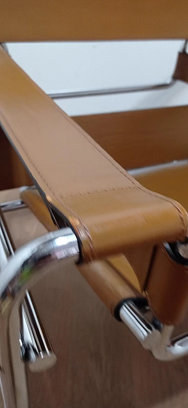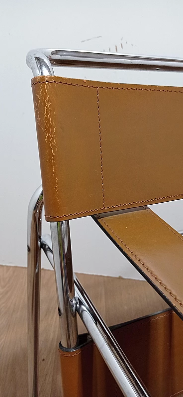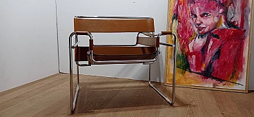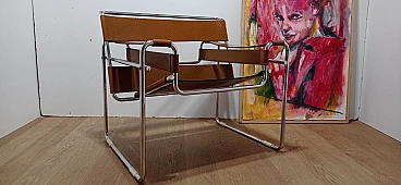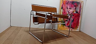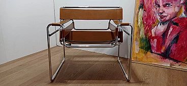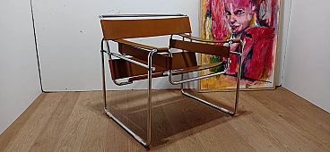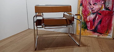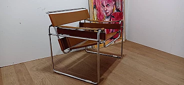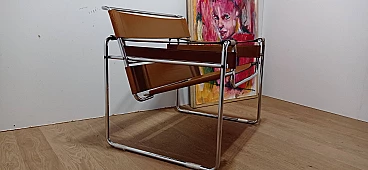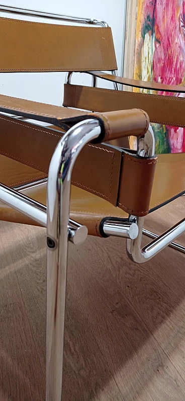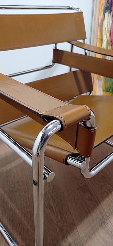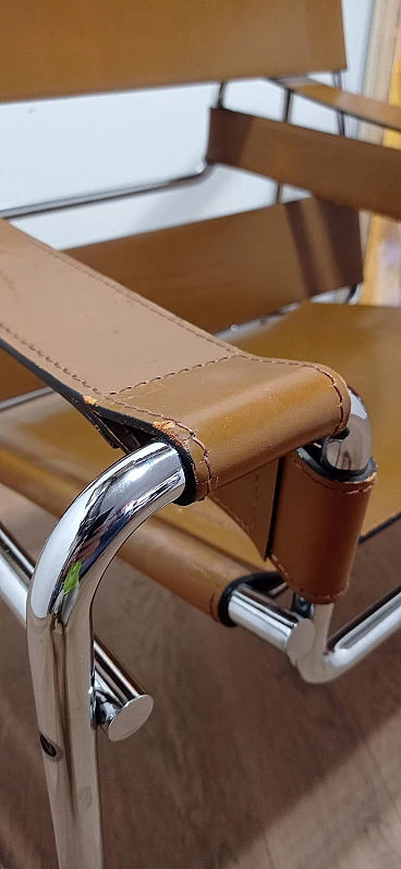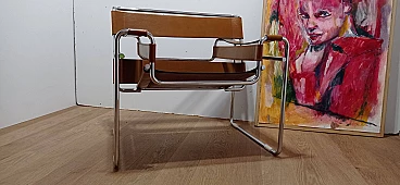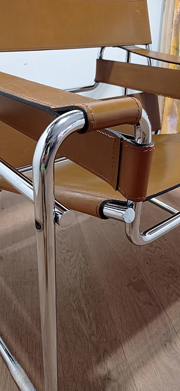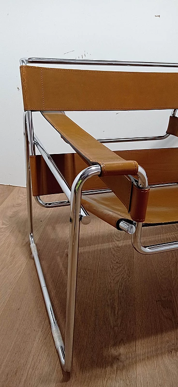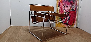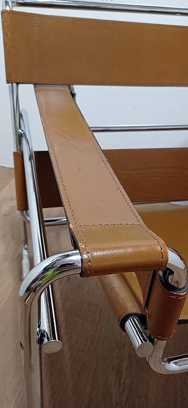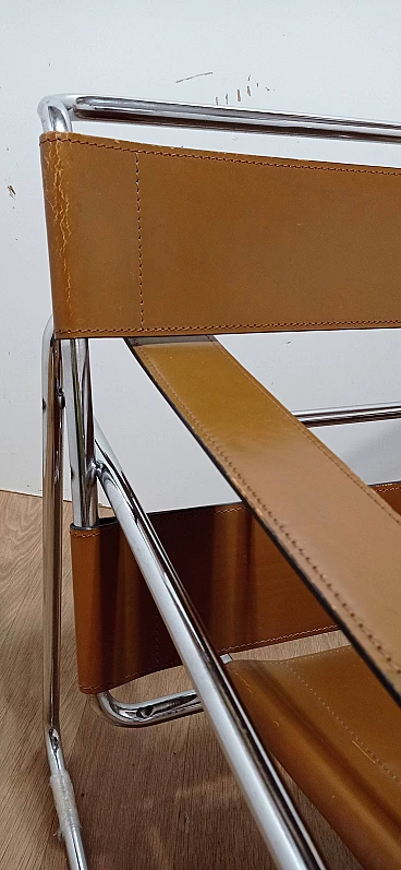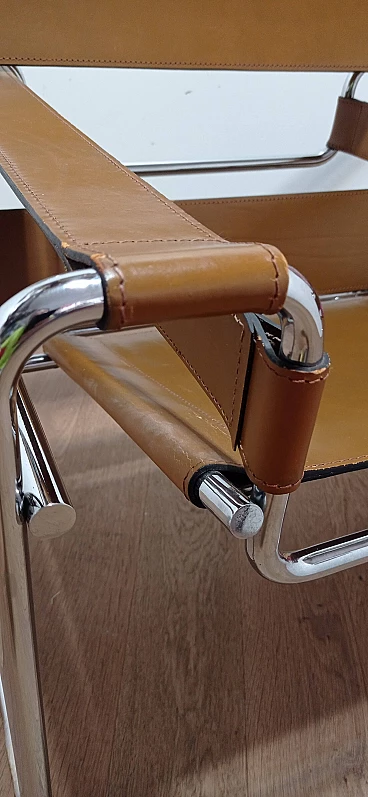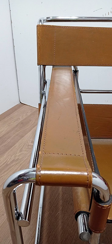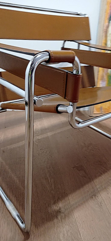 Wassily B3 armchair by Marcel Breuer for Matteograssi 1880, 1988. Very rare model of B3, in excellent condition with minimal signs. Made by Matteograssi 1880 of Truccazzano (Milan), produced in the Tuscan factories. The company produced in the 1980s-90s this luxury model with very high quality. Polished chromed Mannesmann-type steel structure, smooth brown Tuscan tanned leather upholstery with visible stitching. Slight shading, very slight signs and dark grain on leather. Very small marks and dots. Leather creases on the top band of the backrest. It does not have rubber tips on legs.