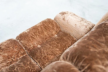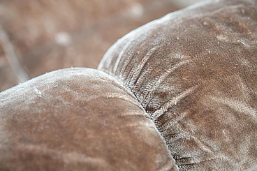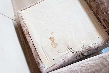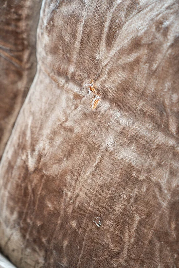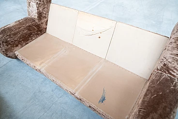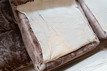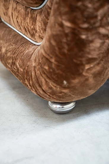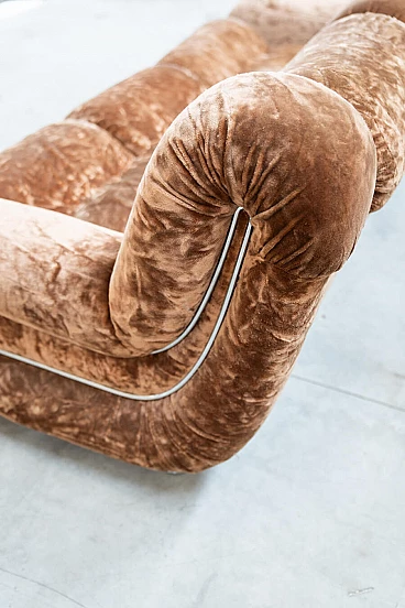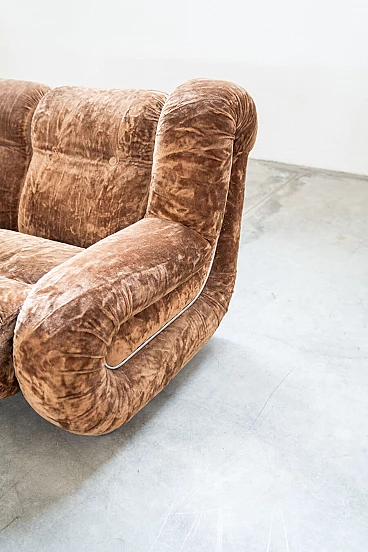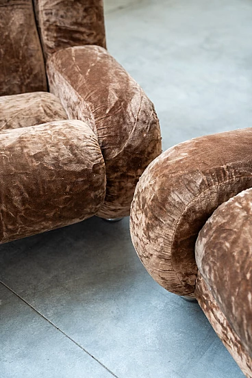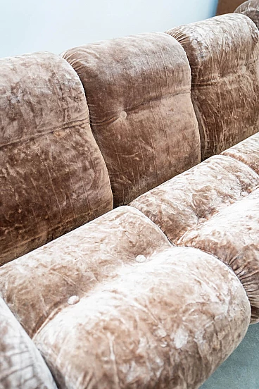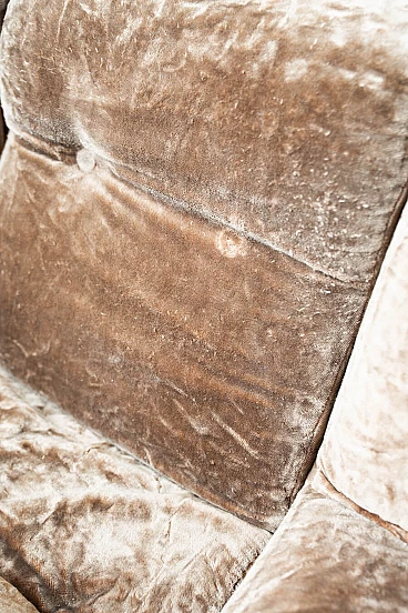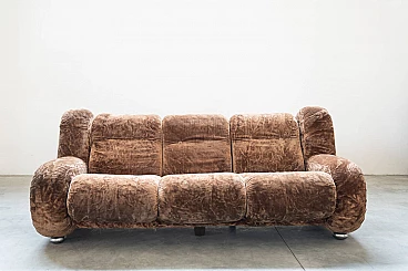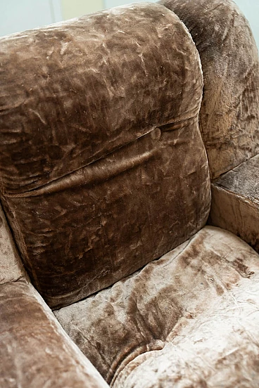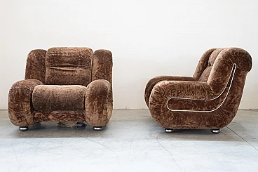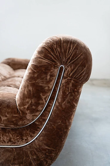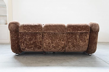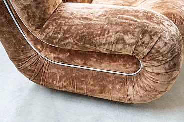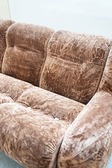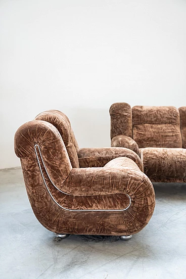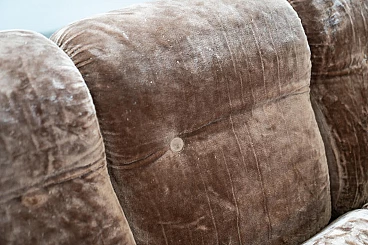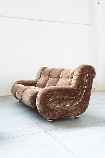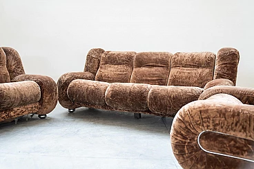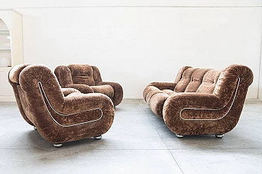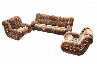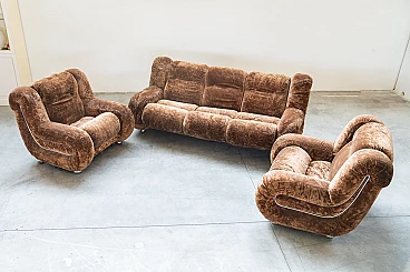 Set consisting of three-seater sofa and pair of armchairs, 1970s. Wooden structure, beige chenille fabric upholstery, aluminum and chrome iron feet. Good condition with signs of wear on fabric and lack of buttons. The sofa is 80 cm high, 205 cm wide and 100 cm deep; the seat is 50 cm high. The armchairs are 90 cm high, 100 cm wide and 90 cm deep; the seat is 50 cm high. Total weight: 100 kg.