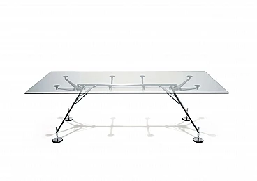 Vintage modernist chrome and glass dining table with a fantastic size of 110.24 inches model Nomos, designed by Sir Norman Foster, UK, and produced by Tecno in 1986, Italy. This iconic design piece has won many awards, most notably the Compasso D'Oro, 1987. The dining table has a futuristic chrome metal frame with black rubber feet and an original greenish glass top. The feet are adjustable in height.