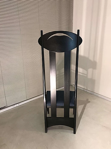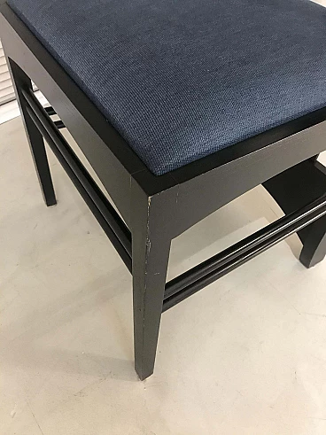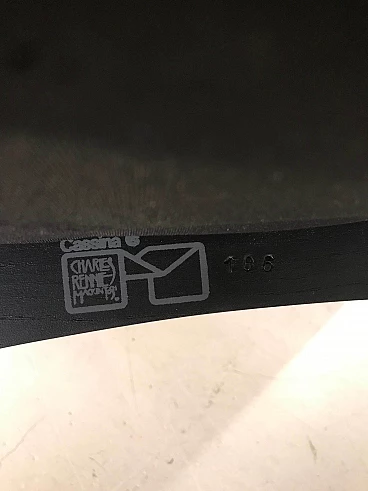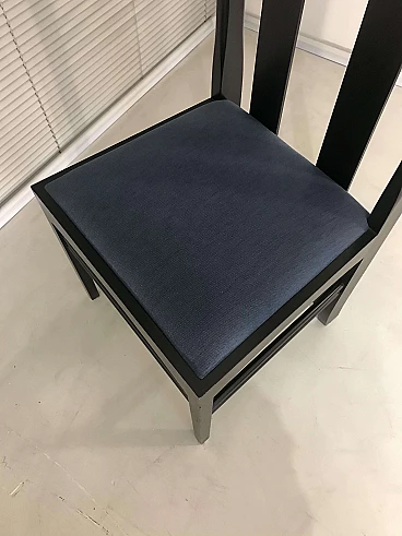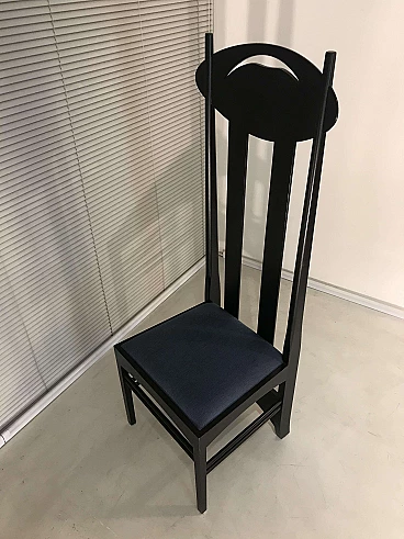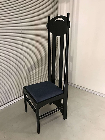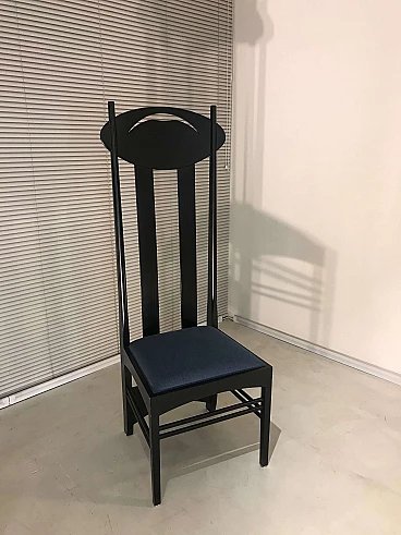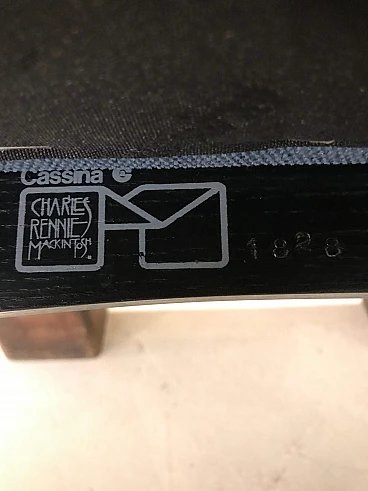 Argyle chairs, design Charles Rennie Mackintosh, produced by Cassina 1973. Chair with black-stained ash frame with upholstered seat covered in exclusive blue fabric. Set consisting of two chairs, the pieces are stamped with the designer's signature, the logo and the progressive production number. Serial no. 106 and serial no. 1828. Purchased new directly from the Cassina manufacturing company in 1973, now out of production, in excellent condition, never used before, collected for the love of beauty. Dimensions 48 x 47 x h. 46/136 cm.