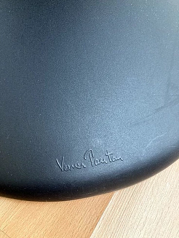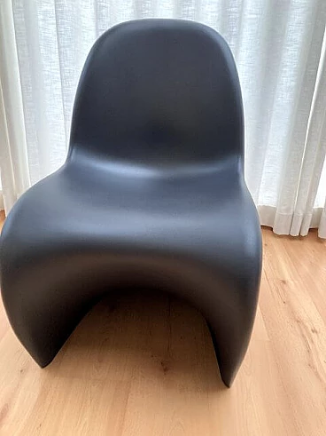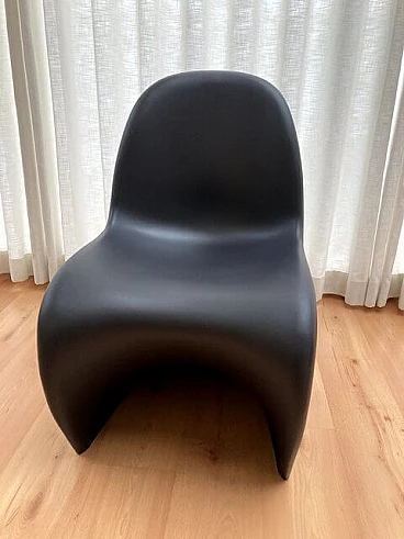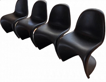 Beautiful set of four chairs by Verner Panton. Produced by Vitra, iconic Panton Chair S with refined and timeless lines, designed by the visionary Danish architect Verner Ponton (1926-1998). In excellent condition. Minimal signs of use. Used for furniture photo shoots. Seats made entirely of polypropylene in matt black finish. Stackable, lightweight and very comfortable chairs, perfect for any environment. Beautiful. L. 60 cm, D. 50 cm, H. 83 cm, H.S. 42 cm.