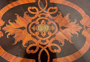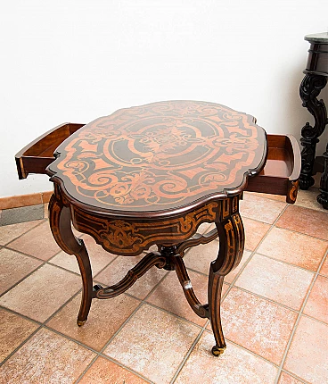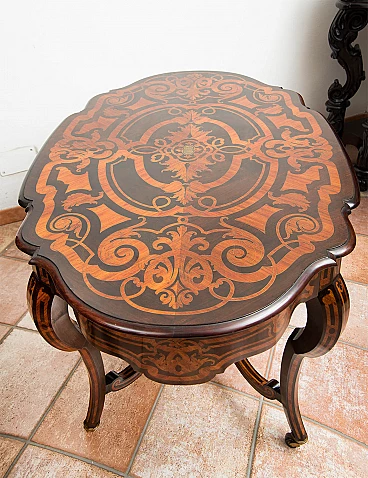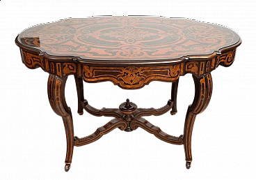 French Napoleon III coffee table or writing desk in exotic precious wood from the second half of the 19th century. The curved undercounter band contains two drawers on the two longest sides. The top has a dense leaf-pattern inlay surrounded by silver fillets and a plaque with the family monogram in the centre. The four cabriolet-shaped feet are connected by a mixtilinear cross with a pinnacle in the centre. Provenance France, 19th century. Measurements: 130x84 cm, H 75 cm. Certificate of Authenticity. Unrestored but in very good condition. We are at your disposal for further clarification or photographic details. Shipping throughout Italy, Europe and the rest of the world at very low prices with maximum security and traceability. Shipping will be agreed privately.