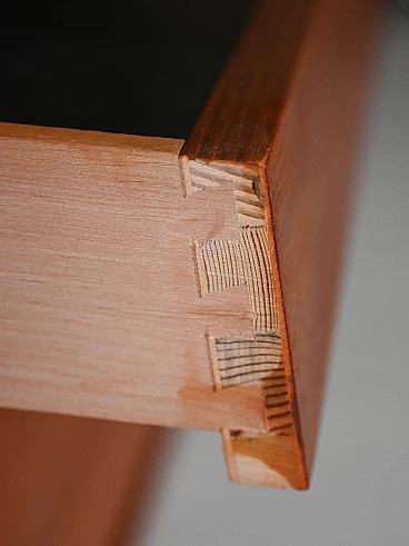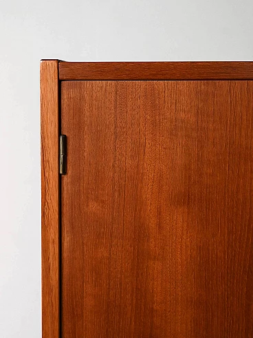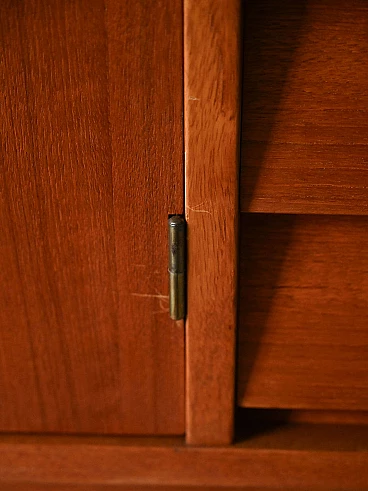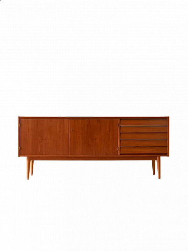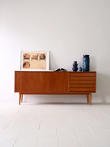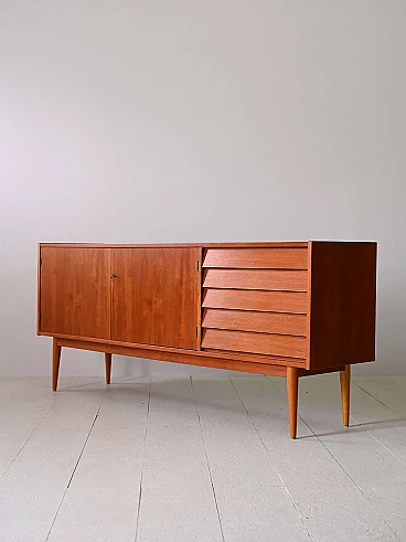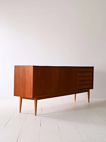 Scandinavian teak sideboard, 1950s. This piece of furniture is an icon of elegance and simplicity, ideal for any room in the home. With five drawers located on the right side and large hinged doors on the left side, it offers practical storage space to meet every need. The tapered legs give a Nordic and contemporary feel, while the minimalist design blends perfectly with any decor. Each drawer, with its slightly protruding handle, is designed for easy access; instead, the hinged doors feature a lock that adds a touch of security to the cabinet. This sideboard is not only functional but also a design element that blends perfectly into any room, bringing a touch of Scandinavian elegance to the home. It may show some signs of time. Please pay attention to the photographs.