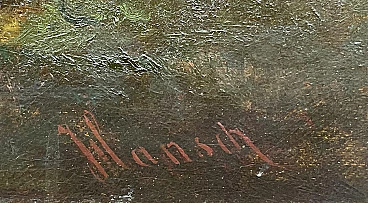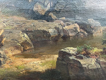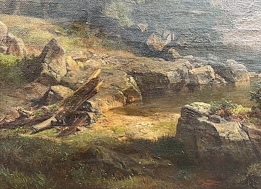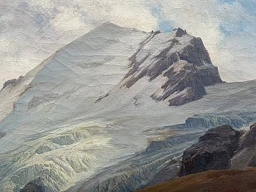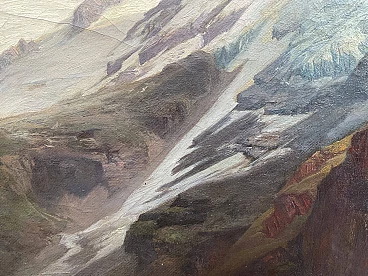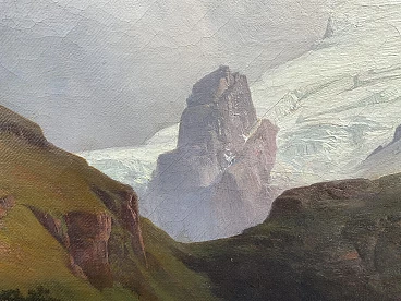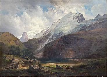 Oil painting on canvas "Mount Titlis with Lake Engstlensee in Switzerland" by Anton Hansch (Vienna, 1813 – Salzburg, 1876). Signed in red lower right "Hansh". The painting, in very good general condition as evident from the attached photographs, depicts Mount Titlis with Lake Engstlensee in the Bernese Oberland, one of the five areas into which the Canton of Bern is divided, developing around the lakes of Thun and Brienz; it extends from the Jungfrau chain to the southern border of the Canton of Bern and is particularly known for the presence of Mount Eiger with its famous north face. Hansch's canvas, coming from an important private Venetian collection, had a significant previous auction in 1989 at Christie's in Amsterdam where it was sold for more than 13,000 euros.