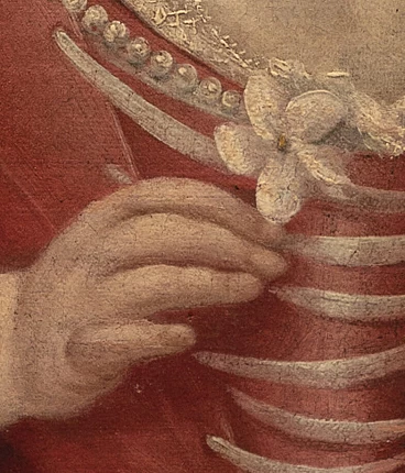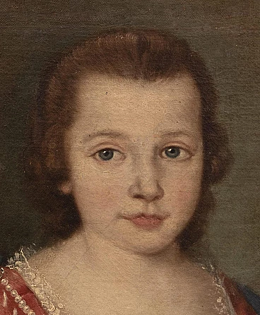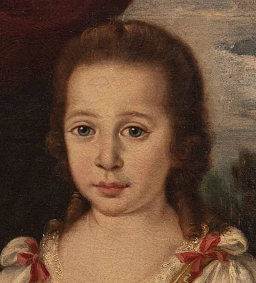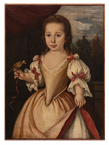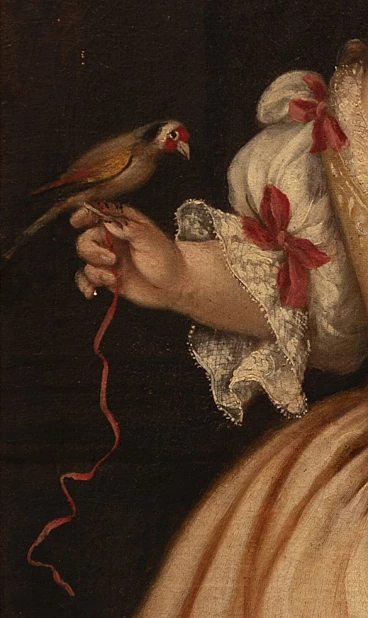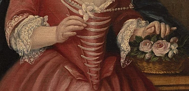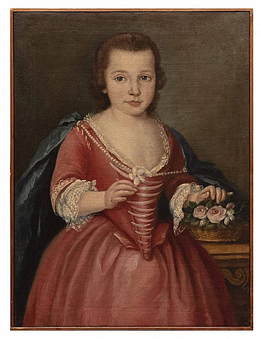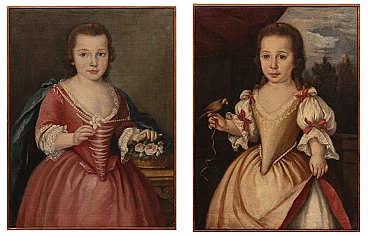 Pair of oil paintings on canvas from the 18th century depicting two young dwarfs made by a Venetian painter from the circle of Alessandro Longhi. The two paintings, in excellent condition, depict two richly dressed young Venetian nobles. The first of hers wears a red dress with elegant lace on the sleeves and neck, she wears a blue cloak over her shoulders; her left hand rests on a small bouquet of roses placed inside a wicker basket while she holds a white flower in her right hand. The second girl, also elegantly dressed in a pink and white dress, has a bird resting on the fingers of her right hand; behind her a landscape opens up. The two paintings come from an important private Venetian collection and precisely this, in addition to the comparisons with other works by the same artist which highlight numerous common characteristics, leads to an attribution to the sphere of the well-known Venetian painter Alessandro Longhi (1733 – 1813).