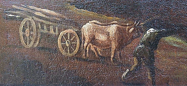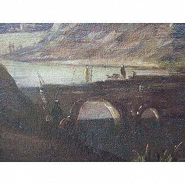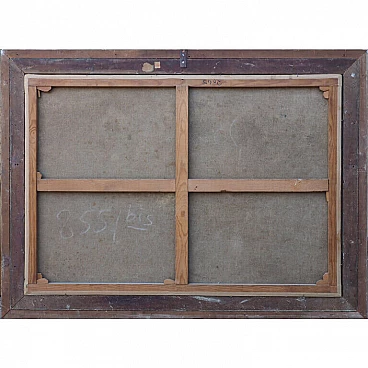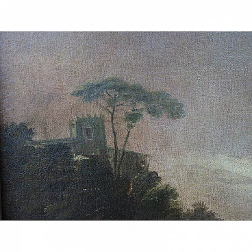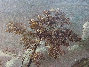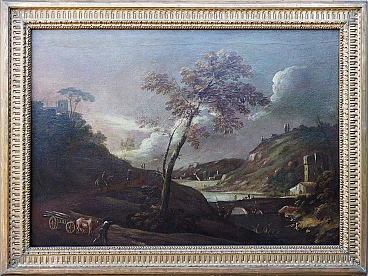 18th-century Venetian painter, School of Marco Ricci, Sunset landscape with figures. Oil on canvas, 78×107 cm. Within a gilded wooden frame, 96×128 cm. The work depicts a typical Veneto landscape at sunset, rendered with a predominance of brown colours and the skilful use of red background preparation. One can recognise the typical traits of the great 18th-century Venetian painters, with clear references to the work of Marco Ricci in whose wake this painting evidently falls. Painting in very good overall condition.