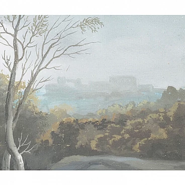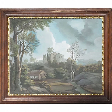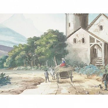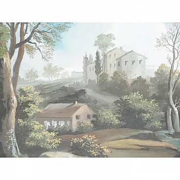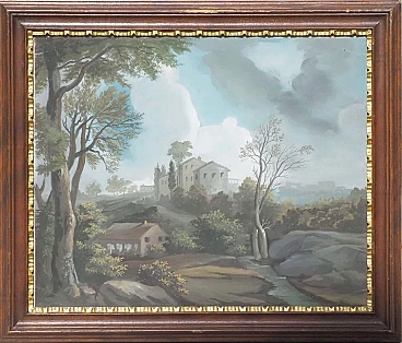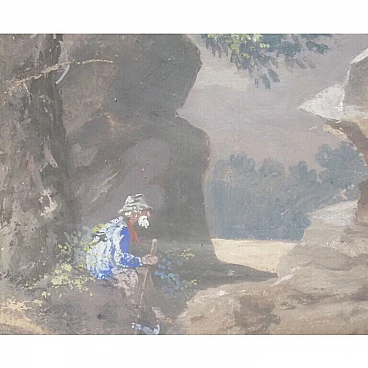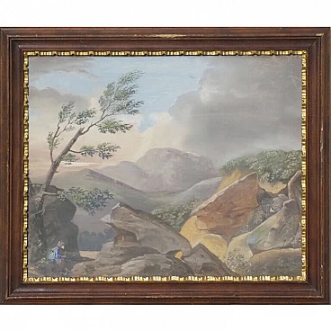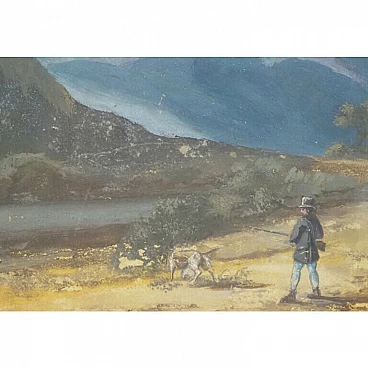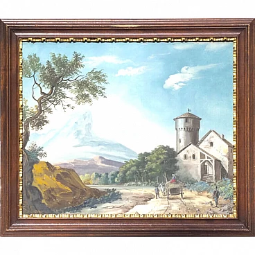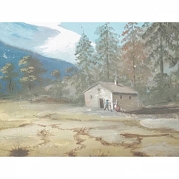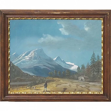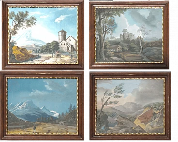 Lot of four views depicting Dolomite landscapes in tempera on paper, 28.5×35 cm, with frame 36×42.5 cm. Veneto, early 19th century. Lot of four tempera paintings depicting: Alpine landscape with peasant wagon and cottage; Alpine landscape with cottage; Alpine landscape with hunter; Alpine landscape with wayfarer. In very good overall condition, some small marks however not affecting the overall quality of the temperas.