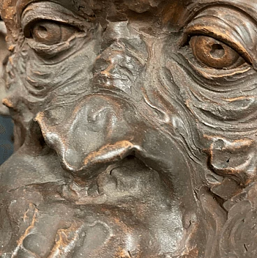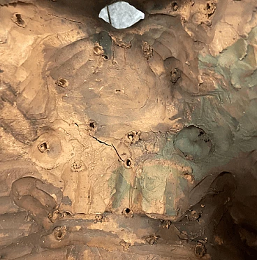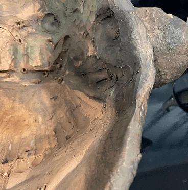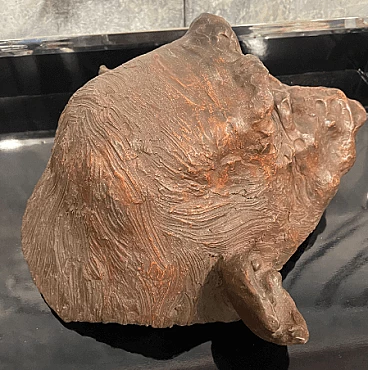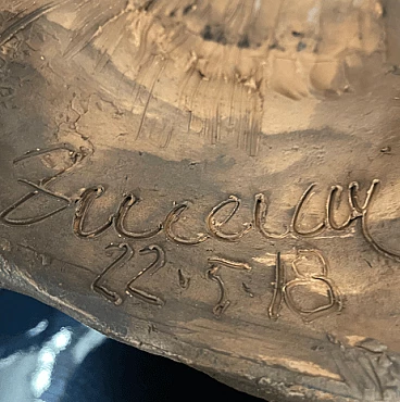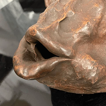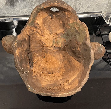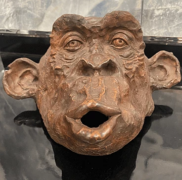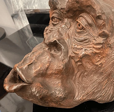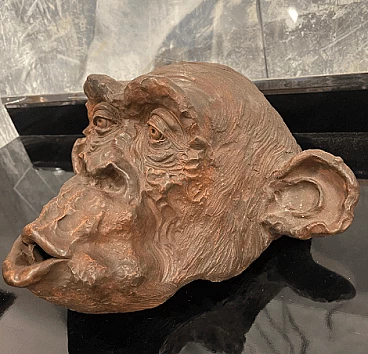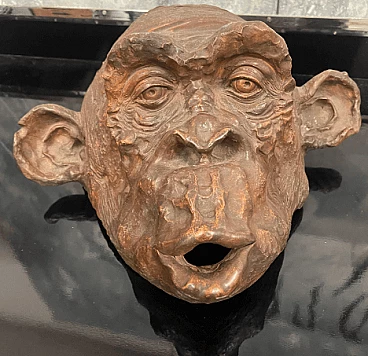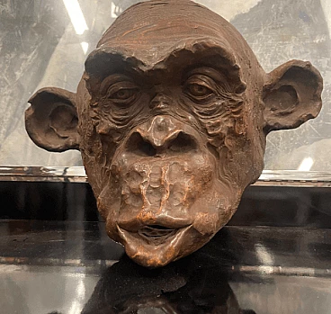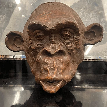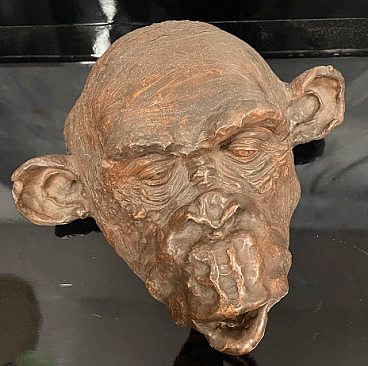 Terracotta sculpture depicting a bonobo monkey head made by Angelo Zanella in 2018. This realistic work, made of terracotta, was born from the hands of Angelo Zanella, a contemporary artist focused on sculpture and painting. Capable of creating paintings of any size, one day, almost for fun, finding a block of clay in the studio, he put himself to the test by modeling this material, specifically to create a monkey head that could be used either by placing it or hanging it on a wall. He realized that his ability went far beyond the paintbrush and created a series of "portraits" of bonobos, each with different details and expressions. This example is signed and dated 2018.