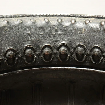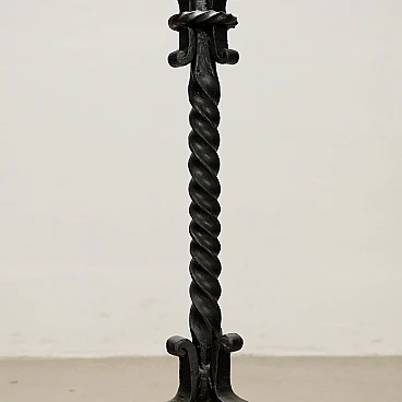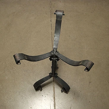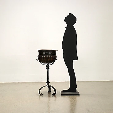 Wrought iron planter supported by three curled feet and a twisted baluster. The basin is made of embossed sheet metal.